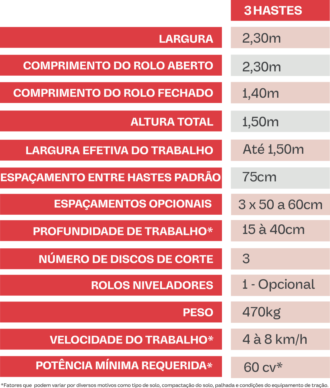 Com 3 hastes em linha, com opção de espaçamento entre hastes de até 75cm, o modelo alia robustez e praticidade, favorecendo a infiltração de água, a renovação de nutrientes e a melhoria da estrutura do solo, preservando a matéria orgânica.